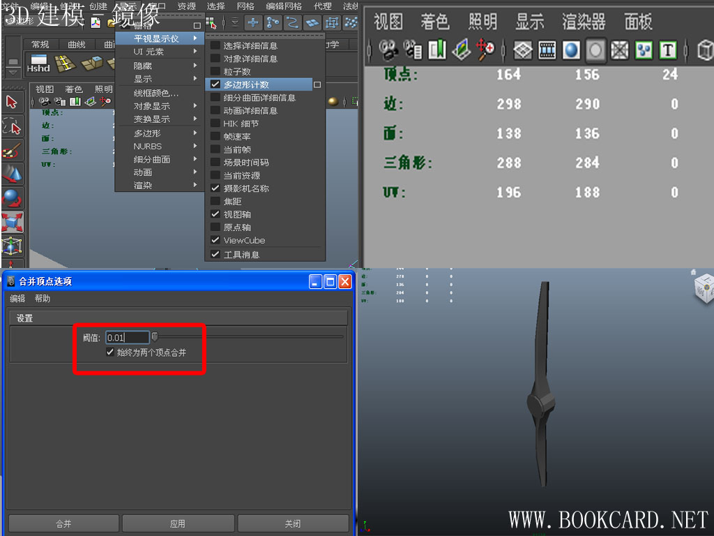- 合拼頂點.點擊功能表網格/合拼選項框(Mesh/Merge Options),設置其閥值(Threshold)為01,按回車(Enter)