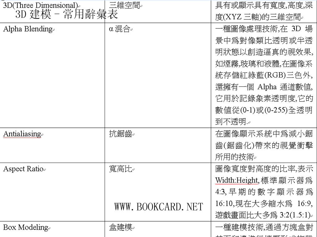 | Alpha Blending | α混合 | 一種圖像處理技術,在3D場景中為對像類比透明或半透明狀態以創造逼真的視效果,如煙霧,玻璃和液體,在圖像系統存儲紅綠藍(RGB)三色外,還擁有一個Alpha通道數值,它用於記錄象素透明度,它的數值從(0-1)或(0-255)全透明到不透明. |