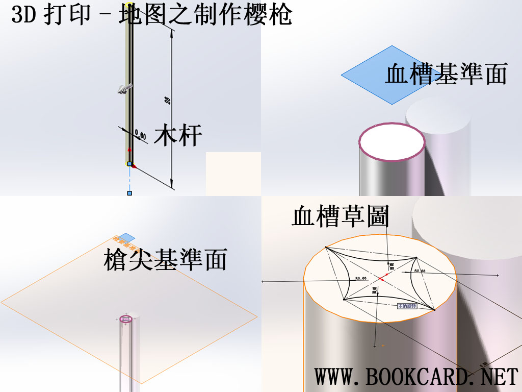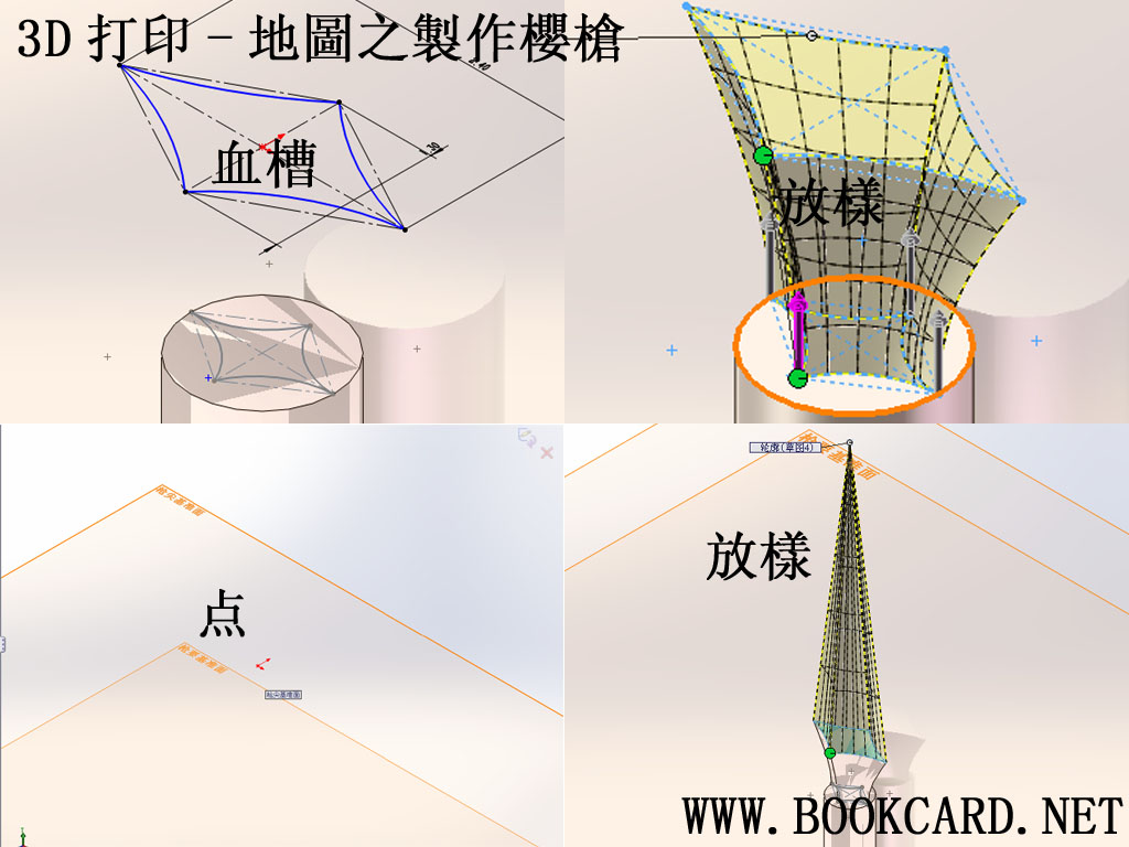- 使用”特徵/放樣”工具,輪廓選擇點與血槽草圖,創建槍尖實體.