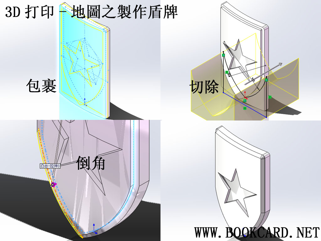8. 使用”特徵/包裹”工具,勾選”浮雕”,厚度填5MM,包裹草圖面選擇”盾牌凸面”,生成星形紋章和盾牌正面弧形