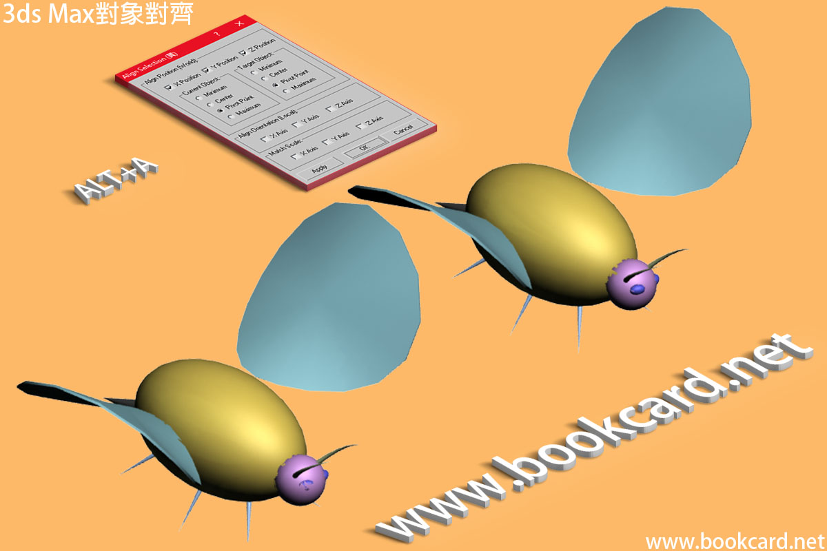 3ds Max若通過移動命令將兩『對像』對齊,你會發現非常無效率. 3ds Max有專用『對齊』Align命令按ALT+A鍵.可對齊『燈光』『攝影機』『對象』.但其缺點是無法用於『面』FACE對齊.