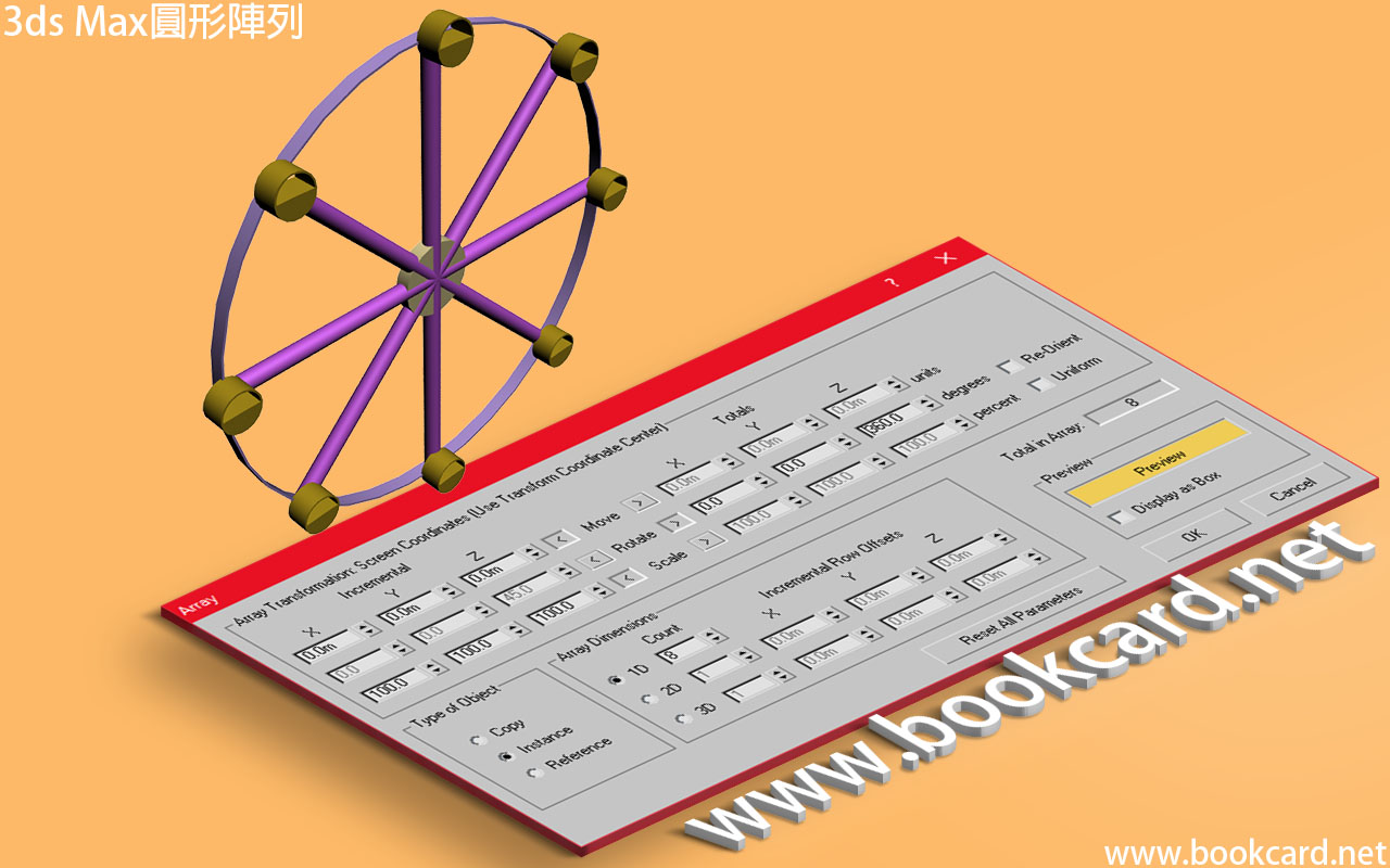 3ds Max『圓形陣列』使用『陣列』array工具.使對『對象』圍繞中心點『克隆』.但需要重置『坐標中心』