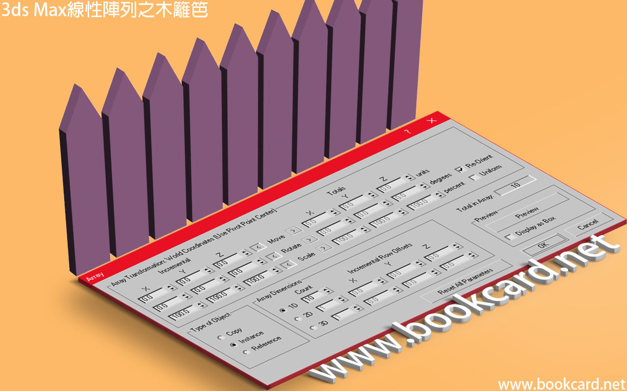 3ds Max『線性陣列』 自動生成對像『克隆』並排成直綫排列.以生成『木籬笆』爲例.