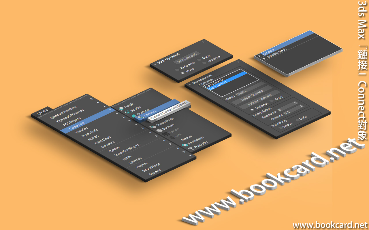 3ds Max『鏈接』Connect用于構建兩個分離之間鏈接橋梁.兩對象需有『窿』用于生成鏈接.若對象多『窿』會嘗試將其全部修補,也可將單一對像與多鏈接起來.但『鏈接』工具未能兼容NURBS對象.