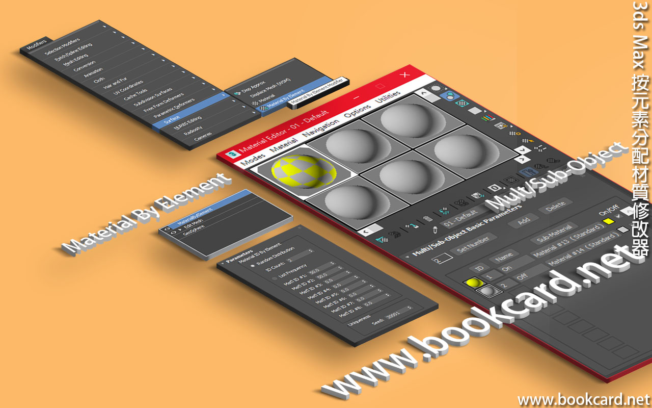 3ds Max 『按元素分配材質』Material By Element修改器隨機分配材質ID, 需與『多維/子對象』材質 配合使用.