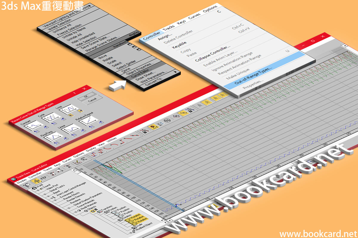 3ds Max重復動畫 作者:月和經倫 2019 年 3 月 25 日2019 年 3 月 25 日 在《3ds Max重復動畫》發佈留言 https://www.bookcard.net/wordpress/wp-content/uploads/2019/03/3dsMax_Honeybee.mp4 3ds Max重復動畫 3ds Max『軌跡視圖』Tack View將若干動畫『幀』在動畫中不斷重復. 按Q鍵點選動畫『對象』. 滑鼠右擊彈出菜單 使用『曲綫編輯器』Curve Editor開啓『軌跡視圖』Tack View 在左側選擇『旋轉』Rotation 『位置』Position『縮放』Scale 軌跡 『控制器->超出範圍類型』Controller->Out-of-Range Types開啓『參數曲綫超出範圍類型』Param Curve Out-of-Range Types 選『循環』Loop並按 作者:月和經倫 月和經倫 檢視更多文章