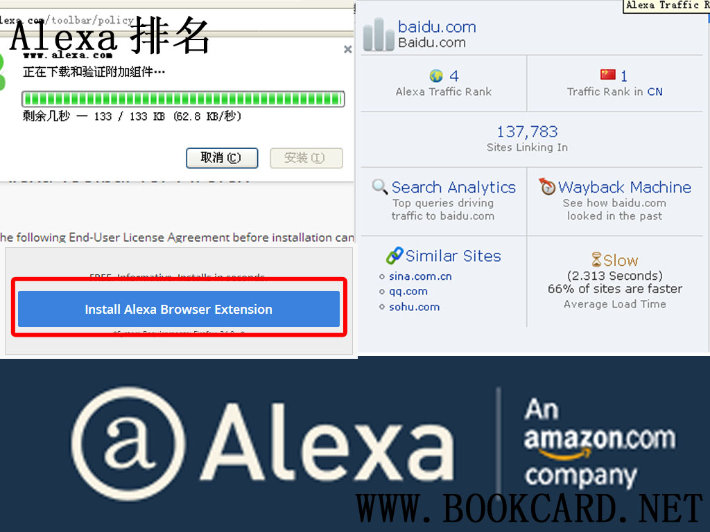 安裝後在瀏覽網頁時Alexa Toolbar就會查找這網站排名,並把瀏覽數據上傳到Alexa的服務器中,所以除非是站長否則一般人是不會安裝的.可以肯定的是Alexa Toolbar的流量數據的權重比並不大.