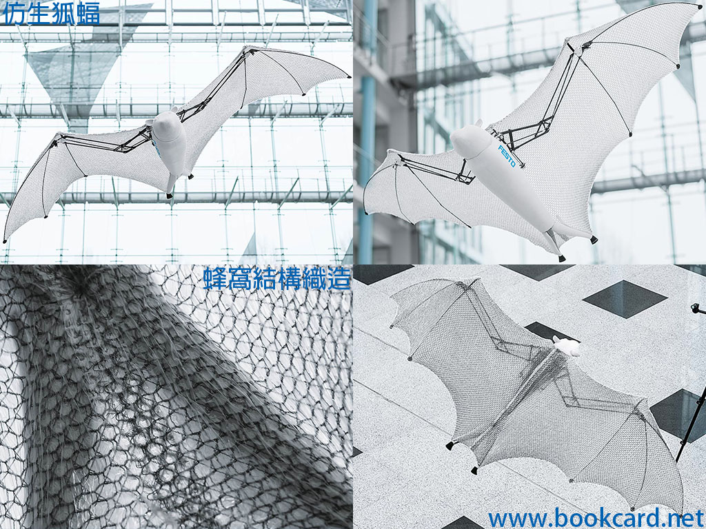 德國festo(費斯托) 的『仿生海鷗』通氦氣的浮力和兩翼的拍打在空中飛行.而最新的『仿生狐蝠』更無需注入氦氣.通過模擬『狐蝠』的特徵倒掉在半空,然後展翼並跳下.接著震翼在空中自主飛翔