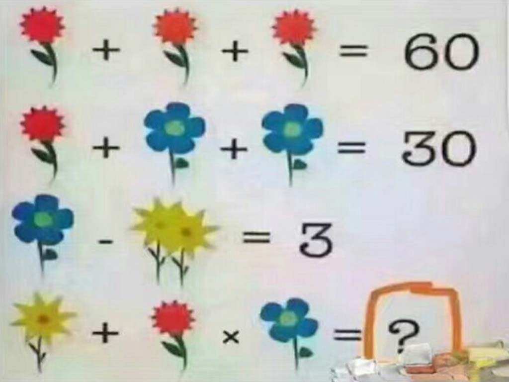 今在歐陽家群出現一條幼稚園大班的算術題,題目是一張圖.圖中的花具有權重相加合得一定的數值,三種花必須符合以下三個條件