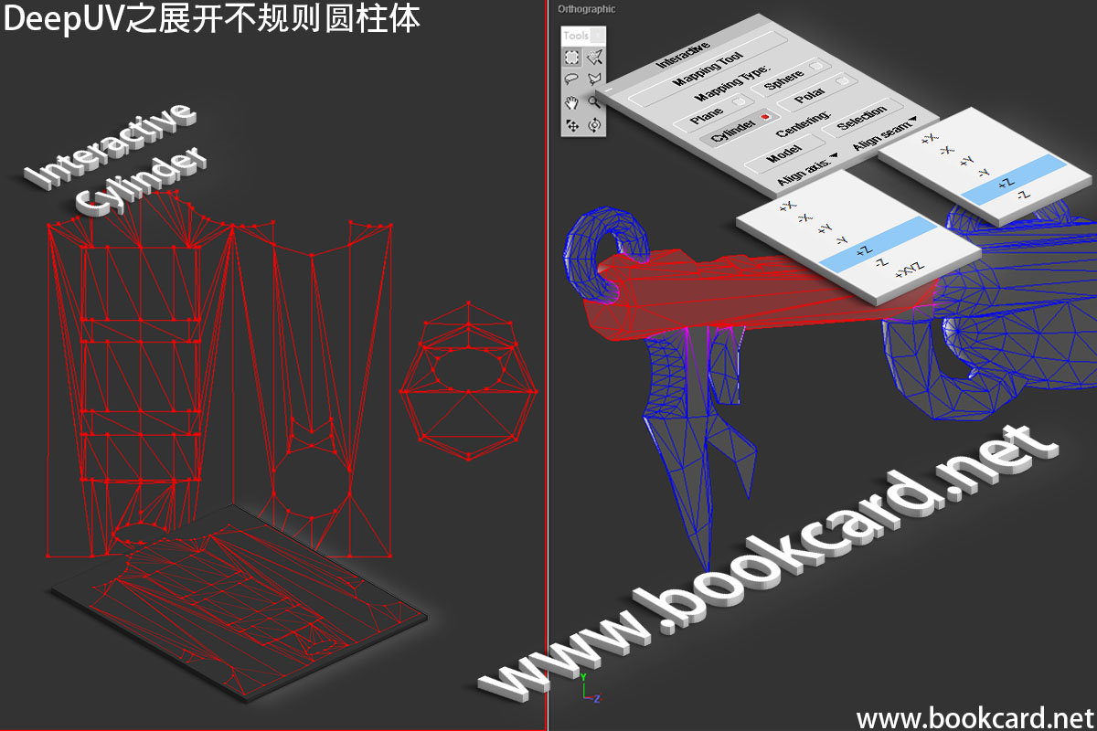 - 『對其軸』Align axis與『對齊焊縫』Align seam均選擇模型軸向(xyz).讓DeepUV沿某軸執行『不規則圓柱體』展開紋理座標.以模型軸向為准.