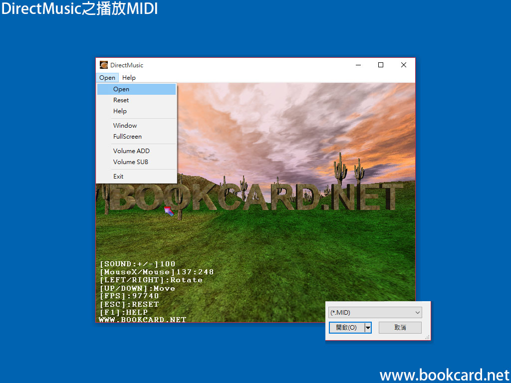 DirectMusic主要用於播放midi數據,而且你無需寫分析器.DirectMusic自動完成所有操作,本.演示程式按ALT鍵彈出MENU再Open打開midi音檔.按+/-鍵控制音量.本想編譯X64版本卻出現『REGDB_E_CLASSNOTREG Class not registered.』所以只有x86程式下載: