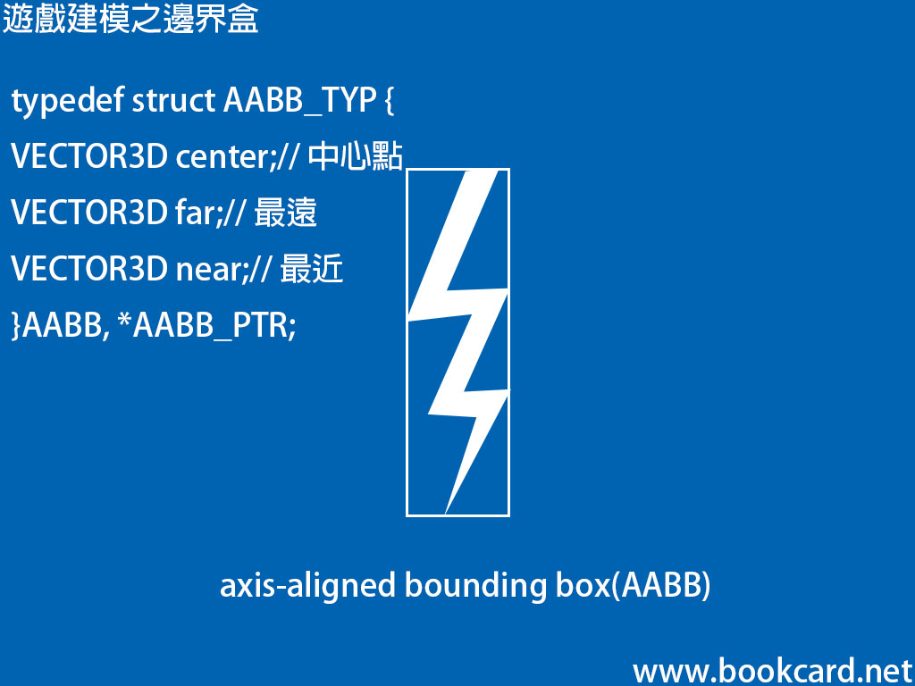 『邊界球』雖然可解卻大部3D模型『碰撞測試』問題.單若3D模型是長條形則不適合如『牆體』『長劍』.『軸對齊坐標邊界盒』axis-aligned bounding box(AABB)引入則可解決這類問題.每個『邊界盒』均由3D模型『中心點』與『最遠點』、『最近點』所組成.通過遍歷每個3D模型頂點找出XYZ三軸上最遠頂點.定義3D邊界盒:
