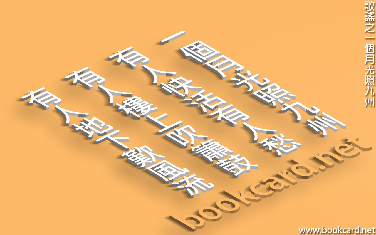 歌謠之一個月光照九州 作者:月和經倫 2020 年 11 月 21 日2020 年 11 月 30 日 在《歌謠之一個月光照九州》發佈留言 一個月光照九州 有人快活有人愁 有人樓上吹簫鼓 有人地下歎風流 『九州』自古漢地,『冀州』『兗州』『青州』『徐州』『揚州』『荊州』『豫州』『梁州』『雍州』 『吹簫鼓』指老舉寨 『歎風流』指捱世界 作者:月和經倫 月和經倫 檢視更多文章