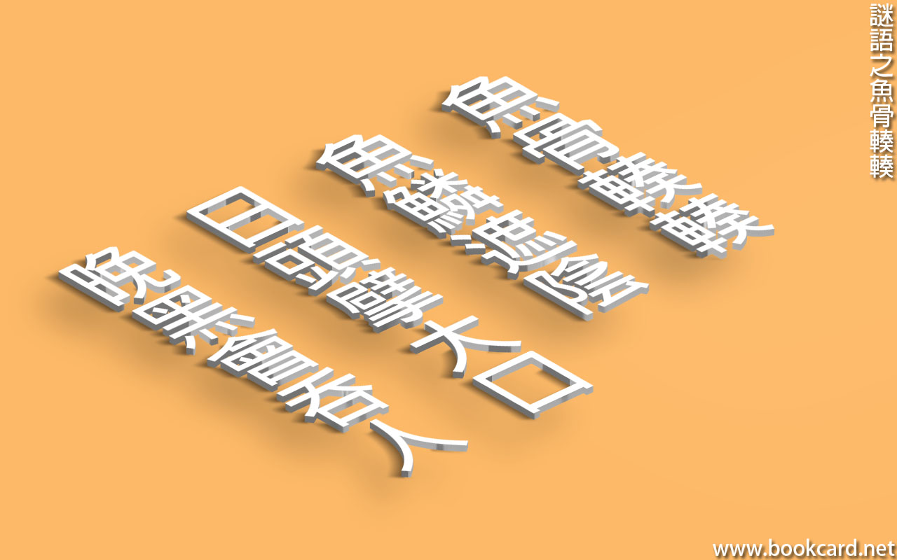 謎語之魚骨輳輳 作者:月和經倫 2021 年 2 月 18 日 在《謎語之魚骨輳輳》發佈留言 魚骨輳輳 魚鱗遮陰 日頭擘大口 晚黑會吞人 貼士: 謎底: 屋企 『魚骨』指『橫樑』, 『輳』指『並輳』 『魚鱗』指『瓦片』 『擘大口』即『擘大口得個窿』指『開門』 『會吞人』指『閂門』 作者:月和經倫 月和經倫 檢視更多文章
