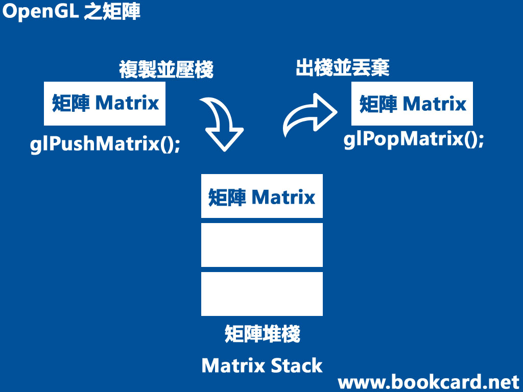 | void glPushMatrix(void); | 複製當前矩陣(棧頂)並壓棧. |