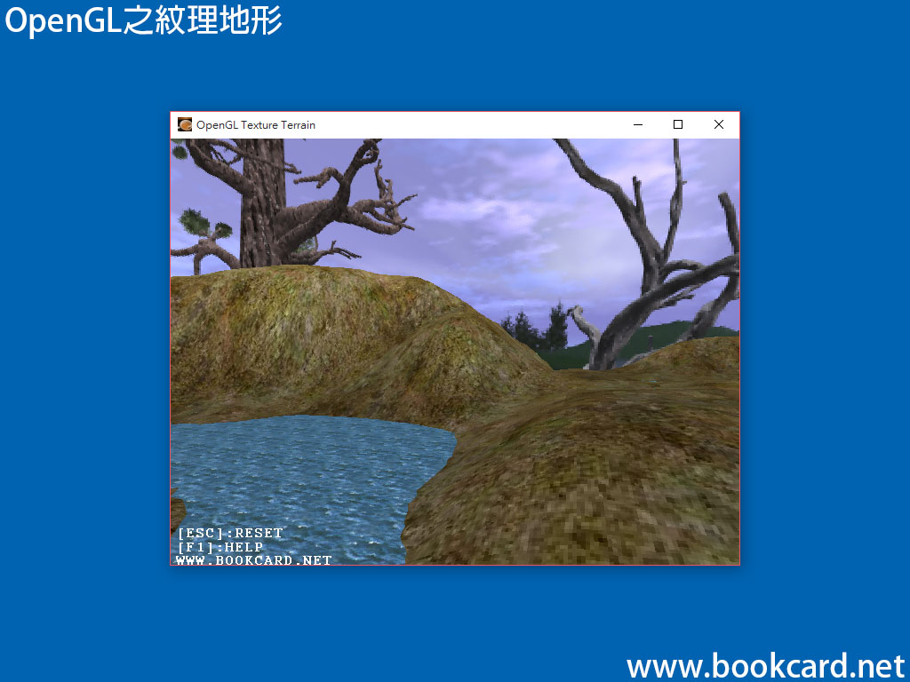 除地形圖外還有海平面掩蓋低窪地帶,海平面由四邊形和的高度值組成,再將『水紋理』應用於四邊形使得海水具有真實感.