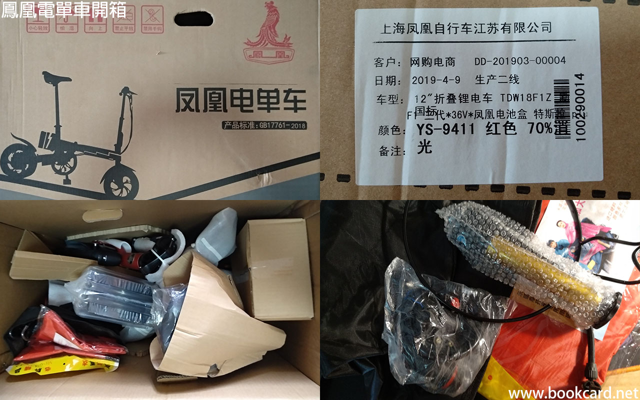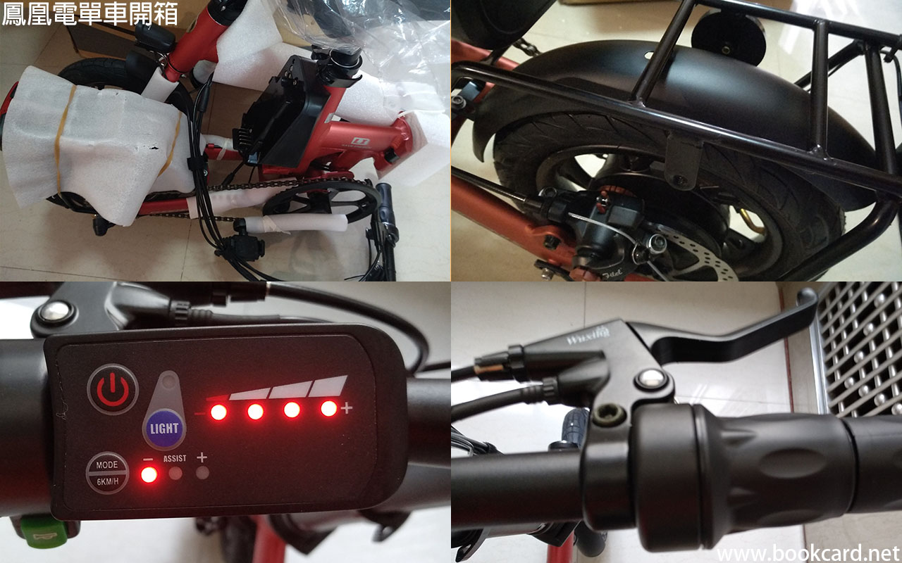 雖然員工搭車唔使錢,因返工地點路遠車疏塞車要成個幾鐘.想買電單車代步.原裝進口買唔起,只可買大陸生産.睇中大陸『鳳凰牌』,原包裝整箱運到樓下.整車已經裝好,安裝車頭車尾兩方形反光牌,前後車輪左右兩側圓形反光牌.圓形反光牌缺一.插入鋰電並鎖死,即完成安裝.車身與車輪均爲鋁,依言比非電動單車重.主要馬達和鋰電重,車輪12寸只可自用唔可車人.前LED燈好過無.車身可摺叠但依然不要帶上大巴或地鐵.人太多依然妨礙她人.『LED燈』與『檔位鍵』開關應設獨立鍵.雖然話防水但一旦大雨控制面板入水『檔位鍵』會失靈.