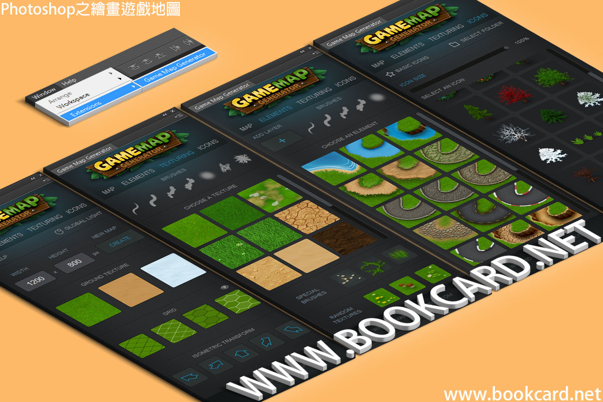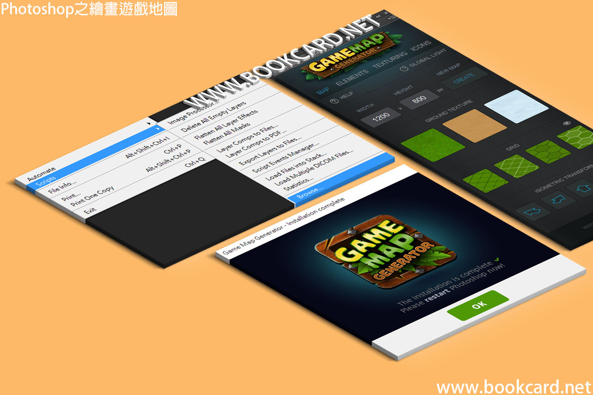 在遊戲設計中『地圖』『背景』『人物動畫』都交給美術處理.若由程序員繪畫則成為噩夢.但『遊戲地圖生成器』Game Map Generator為一款Photoshop插件.可以幫助程序員在10分鐘內製作出專業級『地圖』.安裝Game Map Generator其實可直接拖入Photoshop空白位置完成安裝.