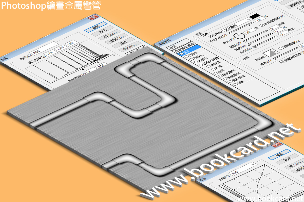 - 讓彎管白色邊緣變清晰.『圖像->調整->色階』Image->Adjust->Levels將『暗調』Shadows與『高光』Highlights滑塊向中間移動.