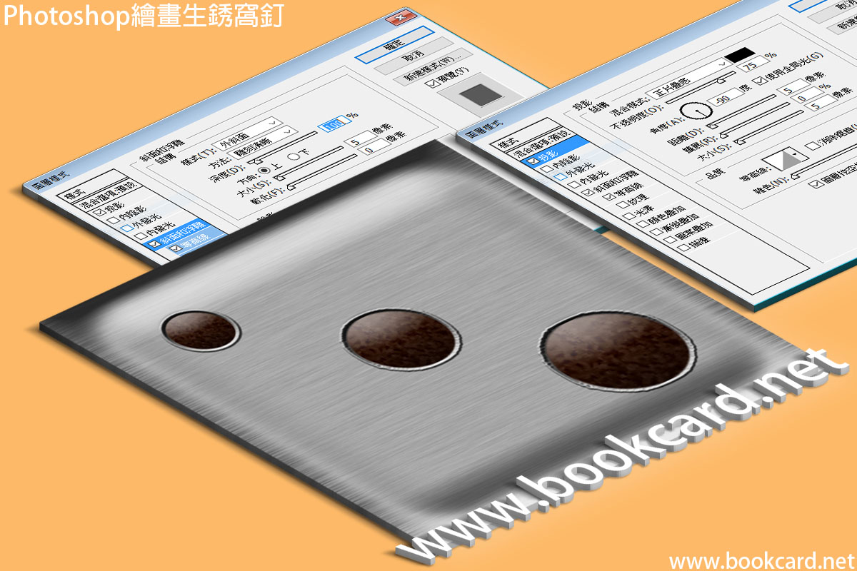- 提升『窩釘』立體效果,對圖層應用應用『斜面和浮雕』Bevel and Emboss樣式