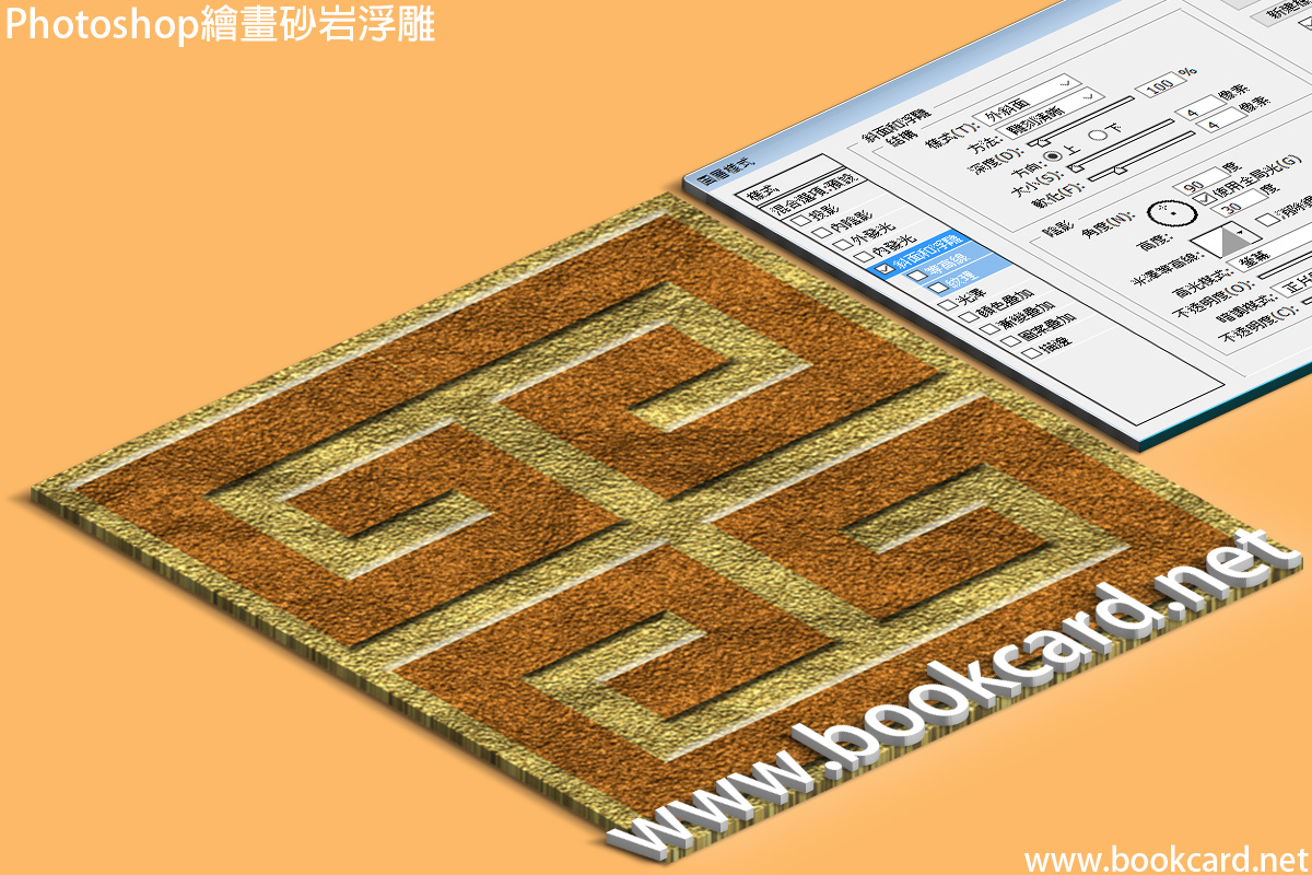 - 『浮雕』圖層應用浮雕樣式Sytle->Bevel and Emboss『樣式->斜面和浮雕』