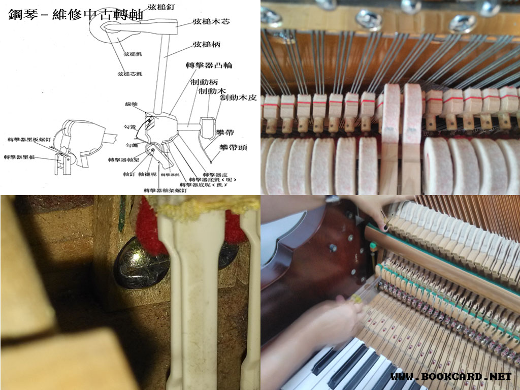 鋼琴-維修中古轉軸 作者:月和經倫 2017 年 5 月 11 日2017 年 8 月 1 日 在《鋼琴-維修中古轉軸》發佈留言 鋼琴-維修中古轉軸 鋼琴-維修中古轉軸 因為外力的碰撞,有可能造成轉軸鬆動,可嘗試更換軸針,先擰送中古軸架鑼絲,推開其他弦槌取出中古,先把原有軸針推出,可使用小針將其推出,然後用鉗拔出軸針,然後插入直徑稍大(粗)的軸針,然後剪掉軸針針頭,軸架轉動要暢順但不能浮動,如果軸針過大(粗)可能會造成軸架無法轉動暢順,如過更還軸針後也一樣浮動,只能更換中古,可以使用辣雞融解膠水,然後使用白乳膠重新粘上,安裝是推開其他弦槌,安裝時鑼絲要先倒牙讓螺紋對正擰入.然後撥正弦錘. 作者:月和經倫 月和經倫 檢視更多文章