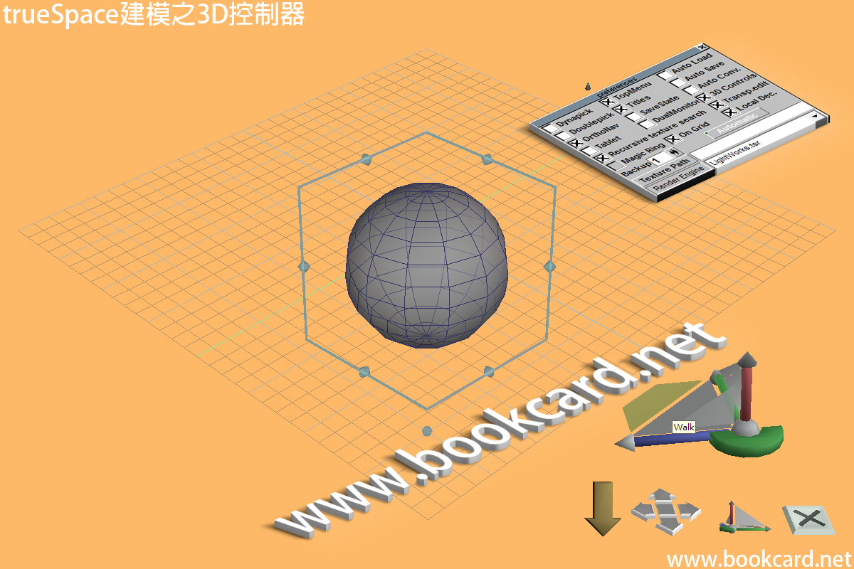 trueSpace『3D控制器』它可以幫助你.對『模型』『點』『邊』『面』進行操作. 『3D控制器』包裹著模型,每條邊分為三段『中間』移動與『兩則』縮放『圓球』旋轉.操作時切換到『正交投影』已保正沿某軸完成操作.要顯示『視點控制器』必須打開『3D控制器』.打開『設置』preferences勾選3D Controls.要隱藏即取消勾選.