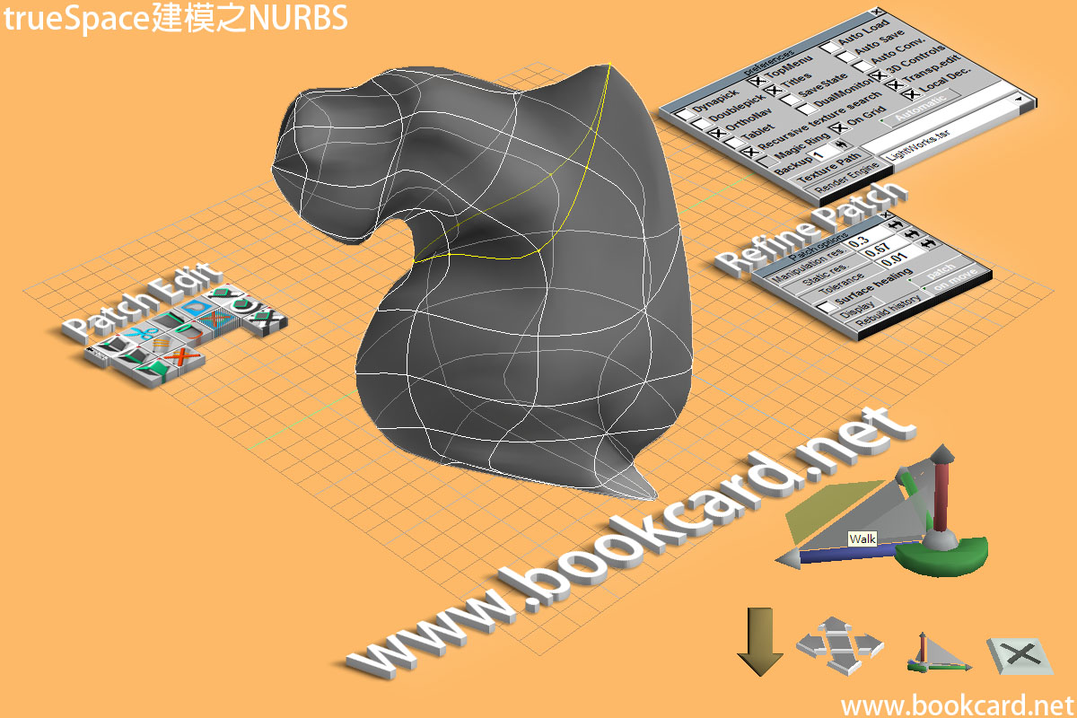 NURBS全稱Non-Uniform Rational B-Splines.漢譯為『非均勻有理B樣條』.『B樣條』其實就是『貝賽爾(Bezier)曲線』, NURBS為高密度網格但呈現出平滑外型.trueSpace作為與『3D Studio MAX』與『Maya』同級別三維軟件當然也支持NURBS.建模過程與使用『橡皮泥』手工製作模型非常類似.剛開此使用時你可能不習慣.但好快會喜歡它. NURBS建模缺點是顯著增加多邊形量.但NURBS建模速度快.將會是未來遊戲建模方式.但現役手機GPU圖形處理能力還差一大截.控制多邊形數量還很必要.
