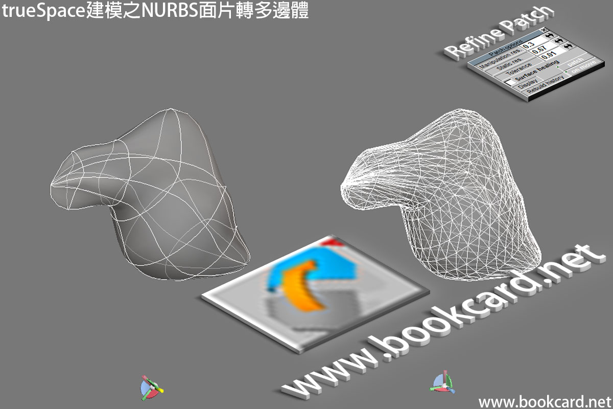 trueSpace使用NURBS完成建模後,要將其組合或導出時.需將NURBS面片轉化為多面體.其實就是將由『曲線』組成面片轉為『直線』組成多邊形