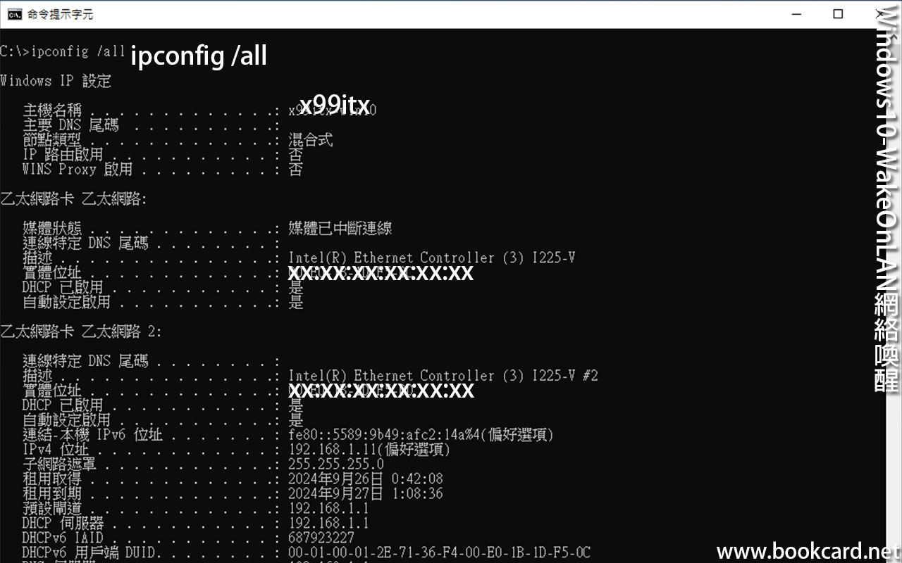 - 進『命令行模式CMD』用『ipconfig /all』得網卡『MAC位圵』同埋『主機名稱』. 『MAC位圵』6字節『xx:xx:xx:xx:xx:xx』.