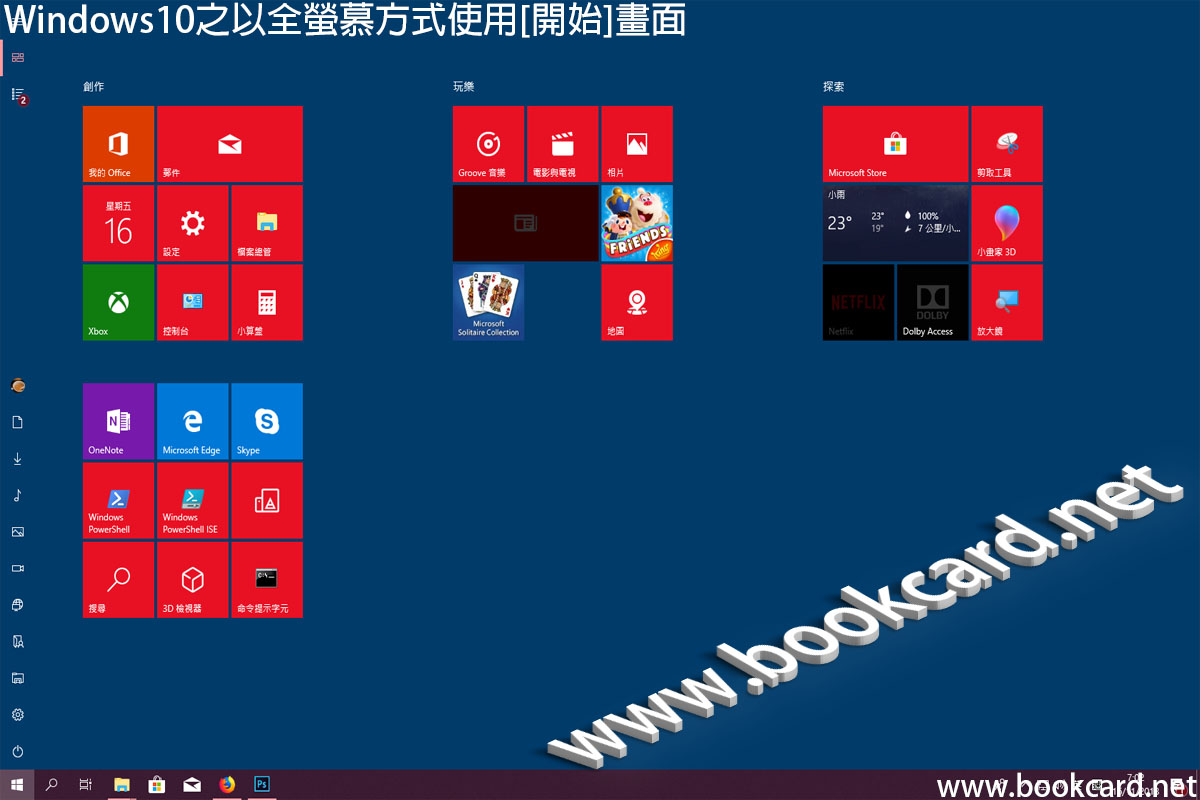 Windows10之以全螢慕方式使用[開始]畫面 作者:月和經倫 2018 年 11 月 15 日2018 年 11 月 16 日 在《Windows10之以全螢慕方式使用[開始]畫面》發佈留言 Windows10之以全螢慕方式使用[開始]畫面Windows10之以全螢慕方式使用[開始]畫面重裝Windows10發現『開始』畫面非全螢慕.只能在『平板電腦模式』切換為全螢慕模式.其實在『桌上電腦模式』也可以設為全螢慕模式. Windows設定->個人化->開始 啓用『全螢慕方式使用[開始]畫面』 作者:月和經倫 月和經倫 檢視更多文章