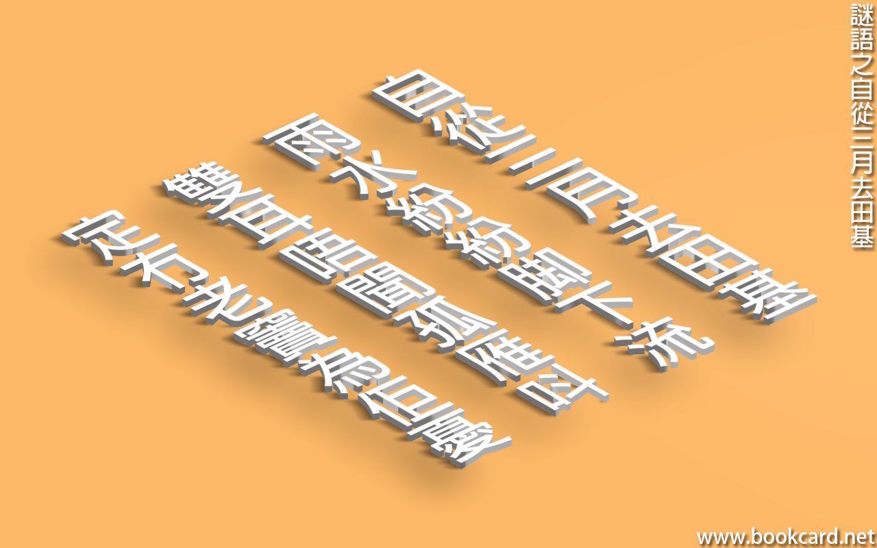 謎語之自從三月去田基 作者:月和經倫 2021 年 2 月 10 日2021 年 3 月 13 日 在《謎語之自從三月去田基》發佈留言 謎語之自從三月去田基 自從三月去田基 雨水紛紛脚下流 雙耳唔聞孤雁叫 定冇老竇爲佢憂 貼士: 謎底:田中草人 『呌』即『叫』『聲聲叫』 作者:月和經倫 月和經倫 檢視更多文章